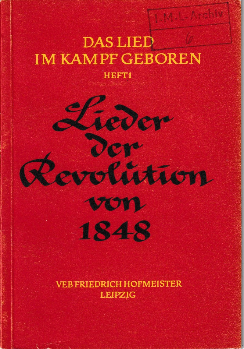 „Lieder der Revolution von 1848“ – zusammen gestellt von Inge Lammel. Herausgegeben von der Kommission Arbeiterlied bei der Deutschen Akademie der Künste – Lieder der Revolution von 1848 (Das Lied im Kampf geboren Heft 1) – VEB Friedrich Hofmeister , 1957 – Leipzig –