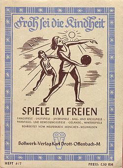 Spiele im Freien erschien 1947 in Westdeutschland und war für die Nachkriegskindheit in der Bundesrepublik gedacht. In der Reihe “ Froh sei die Kindheit “ im Bollwerk-Verlag Karl Drott Offenbach-M. wurde es von Hans Weinberger aus München herausgegeben.