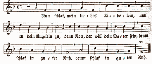 Böhme merkt an: „Ein Wiegenlied für gotselige Kindermeidlein“ von Johannes Mathesius , dem Schüler, Freunde und Biographen Dr. Luthers. Text zuerst als Einzeldruck mit einem anderen Liede von Mathesius o. J. Gedruckt zu Nürnberg durch Friedrich Gutknecht. Mit Melodie zuerst in Mathesius Nachlaß von Felix Zimmermann , Nürnberg 1580. Dann in vielen Kirchengesangbüchern, im Frankfurter 1581, Straßburger 1586 , Nürnberger 1589 , Hamburger 1598 u.a.