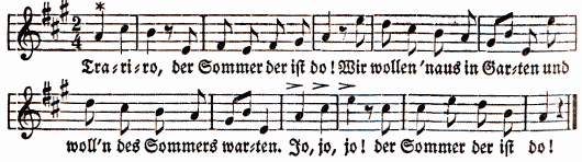 „Auch „Der Sommer der ist da“ oder aber auch: „Trariro – der Sommer der ist do !“ – Siehe: Sommereinholen. Beim Winteraustreiben und Sommereinholen zu „lätare“ nach uraltem germanischen Gebrauch. Zuerst gedruckt im deutschem Museum 1778 Mehr darüber Liederhort III S 331